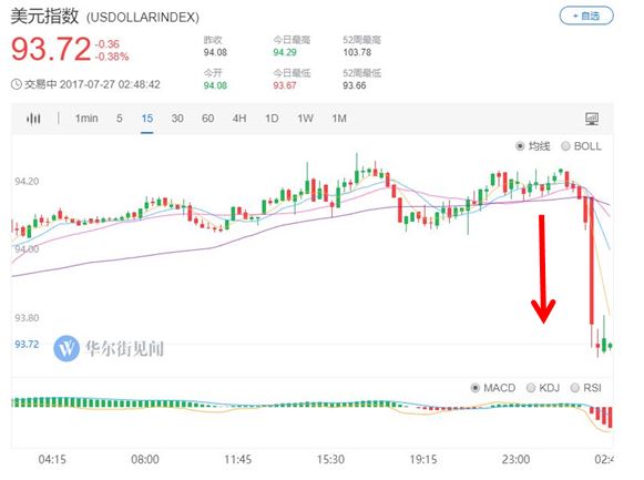 美(měi)元指數迅速回落0.4%,跌破94點關口。歐元兌美(měi)元漲幅擴大至61點或0.5%,刷新日(rì)高(gāo)至1.1707,逼近(jìn)周二所創2015年(nián)8月(yuè)以來(lái)最高(gāo)1.1712。美(měi)元兌日(rì)元下(xià)滑61點,最低(dī)觸及111.56,日(rì)內(nèi)跌超0.2%。現(xiàn)貨黃(huáng)金(jīn)短線上(shàng)揚6.60美(měi)元至日(rì)高(gāo)1255.39美(měi)元/盎司,漲幅擴大至0.4%。